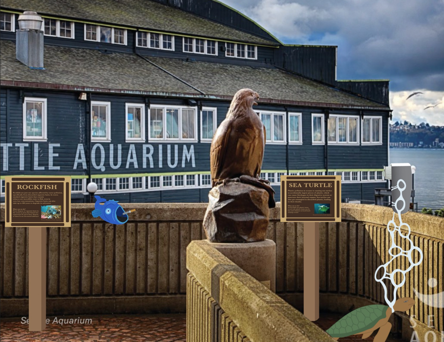 I specifically chose the Seattle Aquarium, as opposed to any other aquarium on the West Coast, because of the unique values and mission of the aquarium. The Seattle Aquarium is managed as a nonprofit by the Seattle Aquarium Society under the supervision of the City of Seattle Department of Parks and Recreation. This aquarium is unique because its fundamental mission is to inspire the conservation of our marine environment and protect the well-being of Pacific marine life. Along with being a place where tourists can visit and learn about marine animals, the Seattle Aquarium also functions as a conservation site and research and educational center where marine scientists lead workshops and events. These are often volunteer events, where people can sign up to help clean local beaches or advocate for more environmentalist policies in local government. They are also a rehabilitation center for injured wildlife and return most of the animals back to their homes once they are healed. I felt that the statements I wanted to make with For the Animals, For the People aligned with the mission of the aquarium and would encourage the public to actually go to the aquarium and learn how they can make a difference. I also included a plaque at various sites of entry onto the boardwalk that explained my vision for this installation and how it relates to the values of the Seattle Aquarium. Ultimately, I wanted to create an interactive experience for the public to have fun while also providing an opportunity for marine and environmental education.